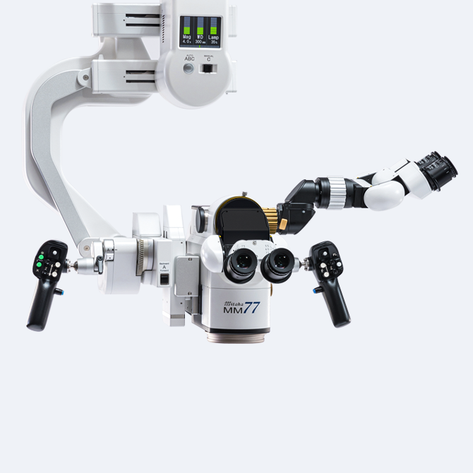 限られたスペースの中で多くの機器が集中する術野において、MM77の小型ボディは余裕のある作業空間を実現します。ワーキングディスタンスは、200mm~650mmまでの広い作業距離を確保し、快適で安全な作業を実現します。